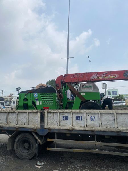 - Xe cẩu 5 tấn chuyển chở xe lu và các loại máy móc nặng, không có thiết bị nâng hạ ở địa điểm giao hàng