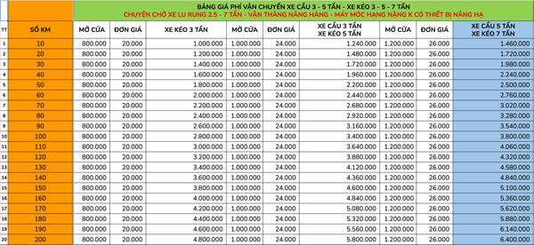 - Bảng tính giá vận chuyển bằng xe cẩu 5 tấn.