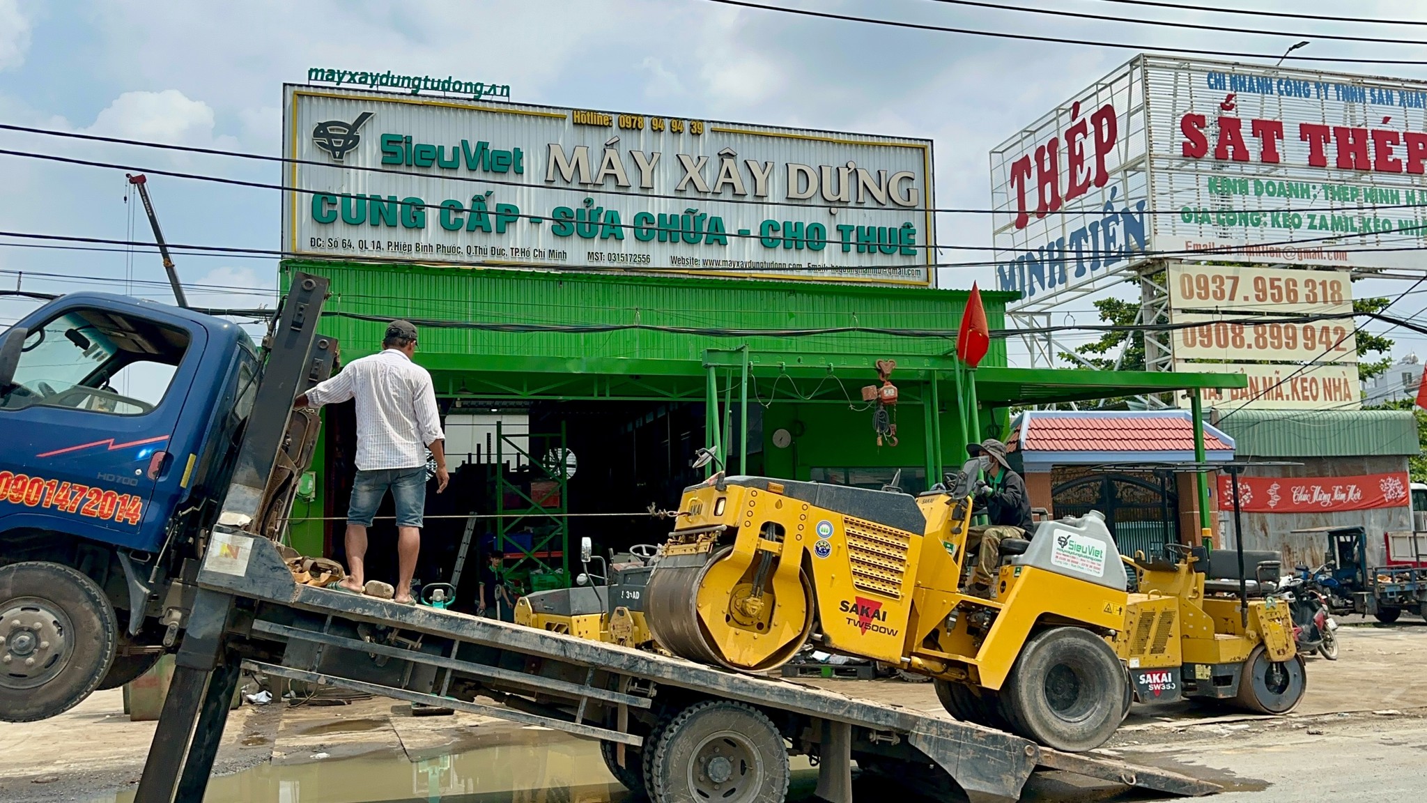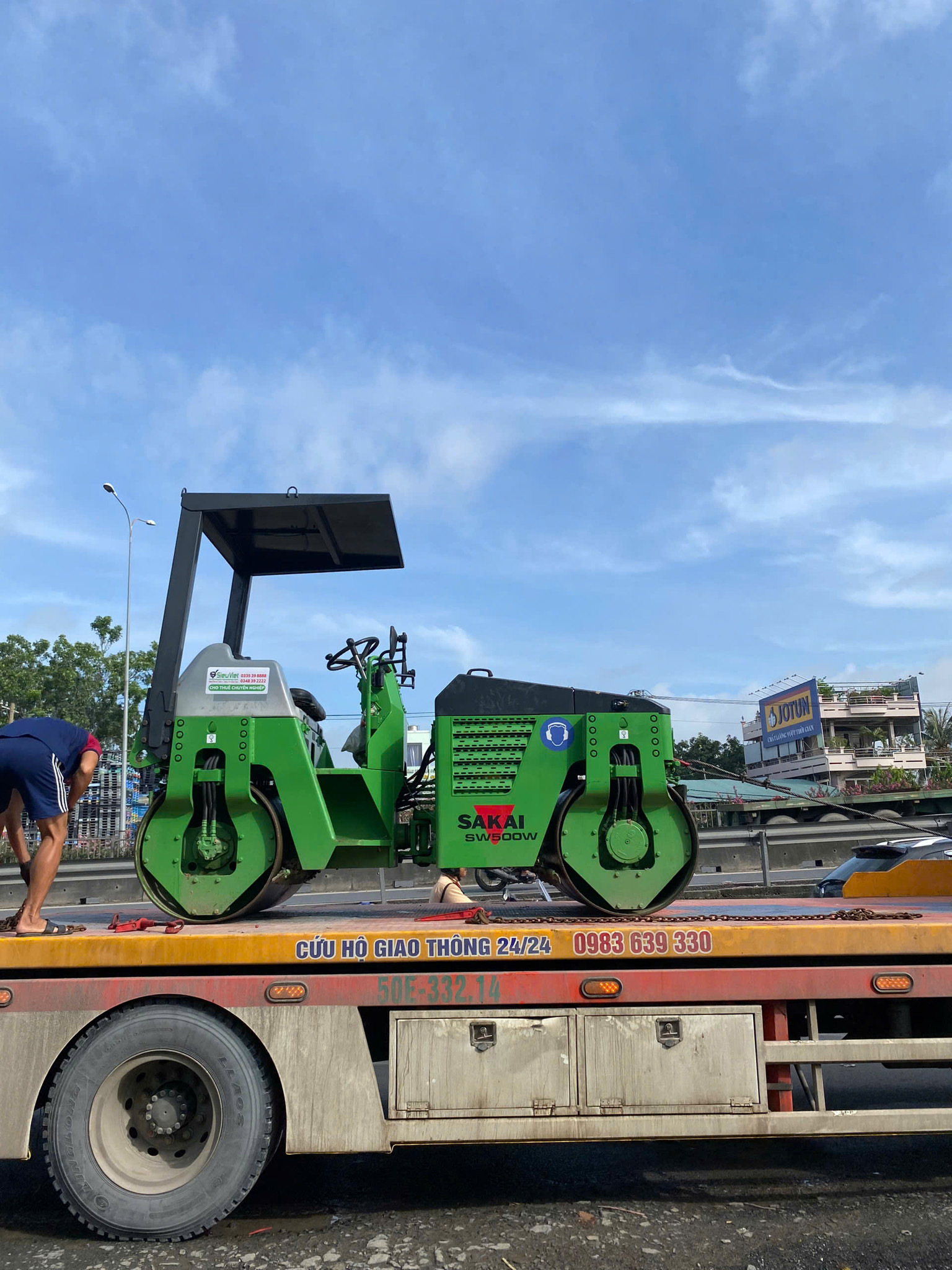 Xe kéo 5 tấn kéo xe lu Sakai TW502 nặng 3.3 tấn và lu dắt tay 750kg