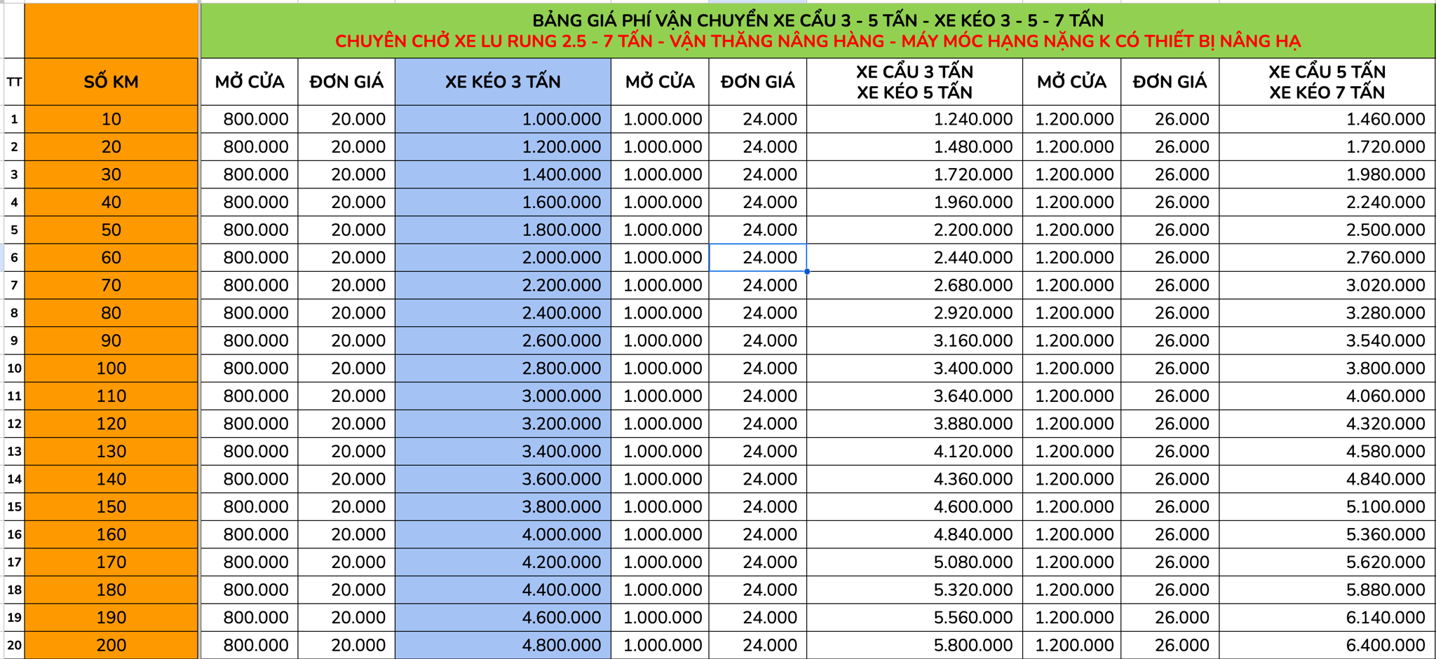 - Bảng tính giá vận chuyển bằng xe cứu hộ - xe kéo 3 tấn